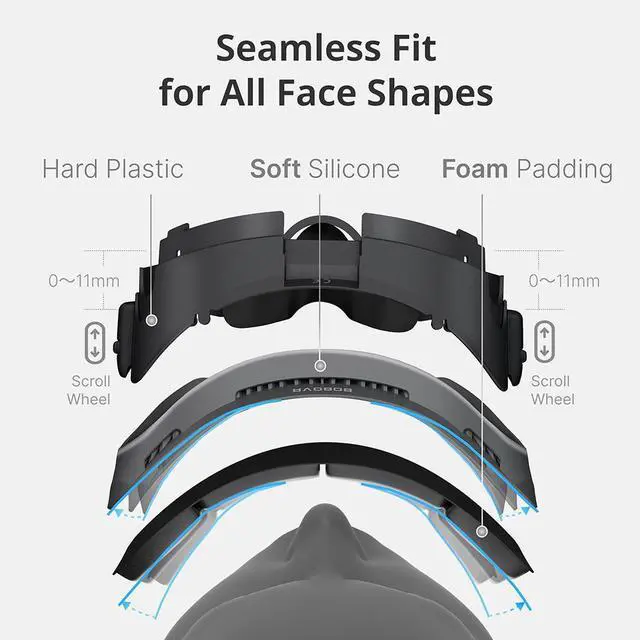- Stepless Adjustment of Face Distance: The interface is equipped with stepless adjustment wheels on both sides, allowing for easy adjustment of the distance between the face cover and the screen, as well as the field of view (FOV), to meet comfort needs and different usage scenarios.