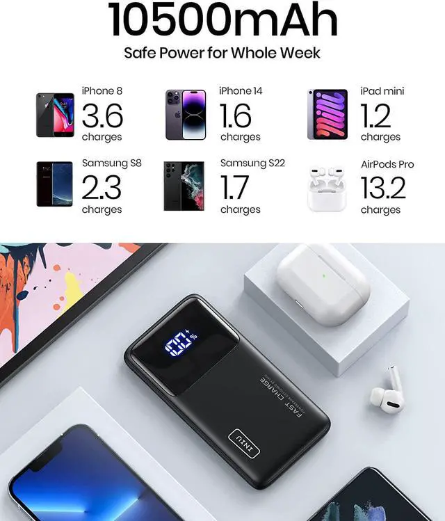 The slim but powerful INIU 10500mAh portable charger can provide Samsung S10 with 2.3 charges, iPhone 8 with 4.0 charges, AirPods Pro with 13.9 charges and iPad with 1.2 charges.