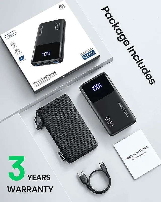 What You GetINIU 10500mAh fast charge portable charger*1, 0.3M /1ft USB A to USB C Cable*1, travel pouch*1, user manual*1, -, INIU industry-leading and.