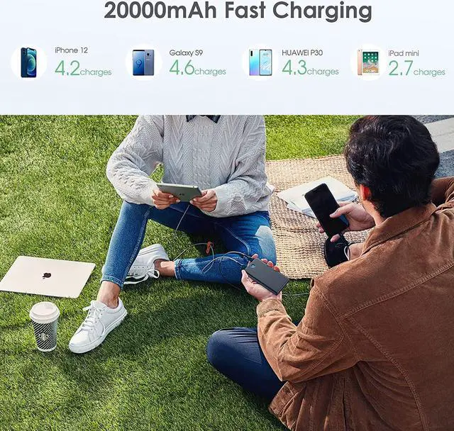 Portable Charger 20000mAh* 2 Pack Two 20000mAh external batteries, no worry about the equipment running out of power. Built-in 20000mAh battery is enough to charge iPhone 12 4.2 times, Samsung Galaxy S9 3.8 times, HUAWEI P30 3.1 times and iPad mini 2 times; not only can be used for personal portable charging, but also can be shared with others.