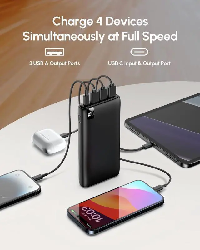 Fast Charge 4 Devices at Once Built in 3 USB A output ports and 1 USB C input & output port, this phone power bank can share power to 4 devices simultaneously at 22.5W max charging speed. This 22.5W power bank features latest intelligent system to protect your devices and itself against over-heat, over-current, over-discharge, over-voltage, short-circuit and more.