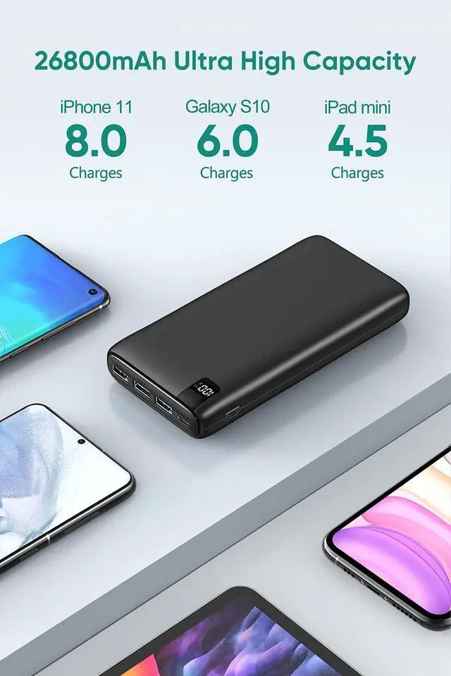 Universal Compatibility & Powerful CapacityEquipped with 26800mAh high-density lithium polymer batteries, this power bank can charge most phones for 7-8 times and other USB devices for multiple times on an average of 7 days of unrestrained usage per charge, and no need to worry about losing contact with anyone due to out of power.