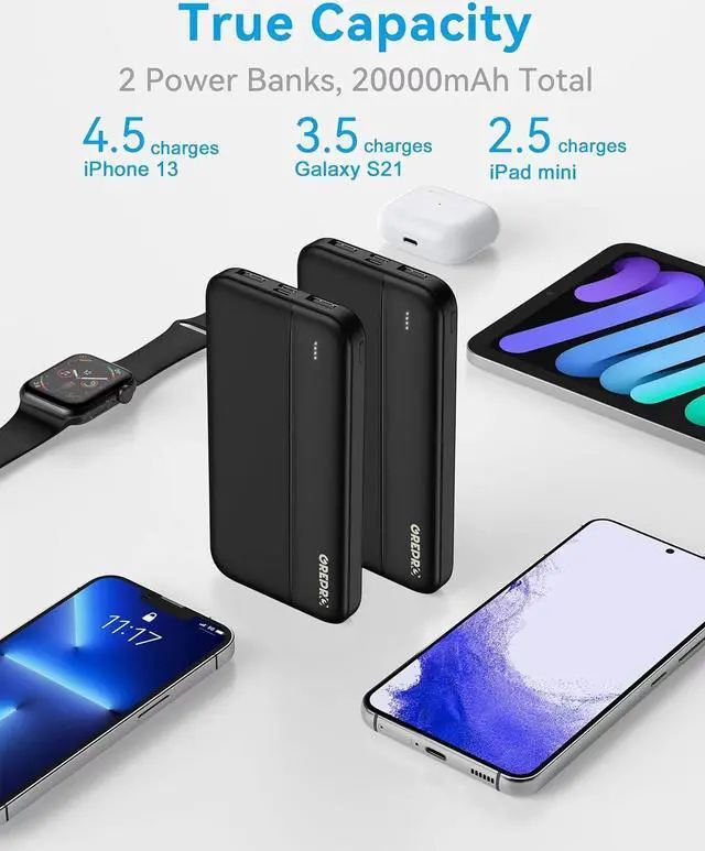 Charge Any Device Anywhere - Never run out of battery again! Our 2-pack 2.4A Portable Charger has a total capacity of 20000mAh, compatible with almost all USB-rechargeable devices. With 4.5 charges for the iPhone 1 3, 3.5 charges for a Samsung S21, and 4 charges for a Huawei P20, you can stay connected all day long!