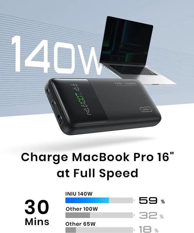 140W PD 3.1 Super-Fast Charging While others struggle at 65W or even 100W, our 140W PD 3.1 PowerNova if fast enough to power up all high-power-demand devices like the laptops and SteamDeck. In just 30 minutes, you'll have a MacBook Pro 16" at 59%, SteamDeck at 57%, iPhone 15 Pro Max at 71%, and Samsung S23 Ultra at 75%.