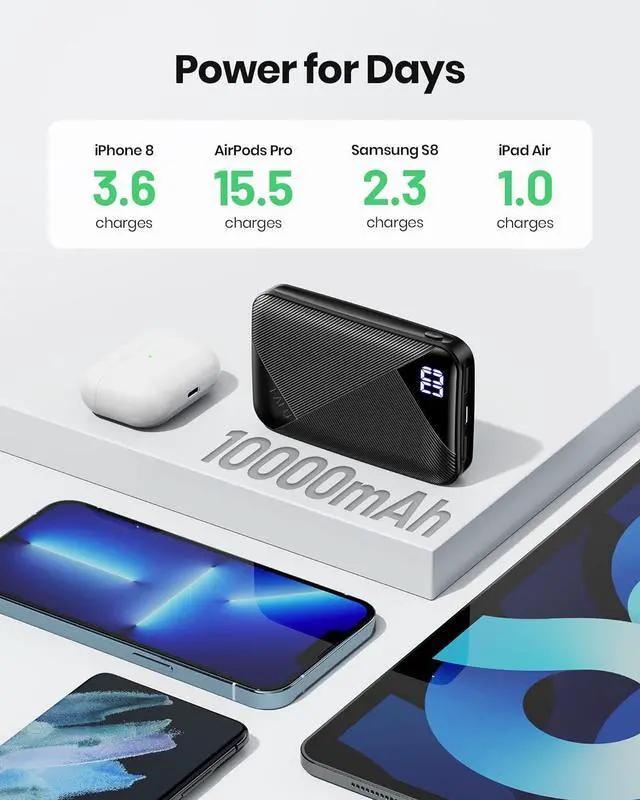 Power for DaysIts tiny size holds a huge 10000mAh, enough to top up iPhone 8 3.6 times, Samsung S8 2.3 times and iPad Air once.