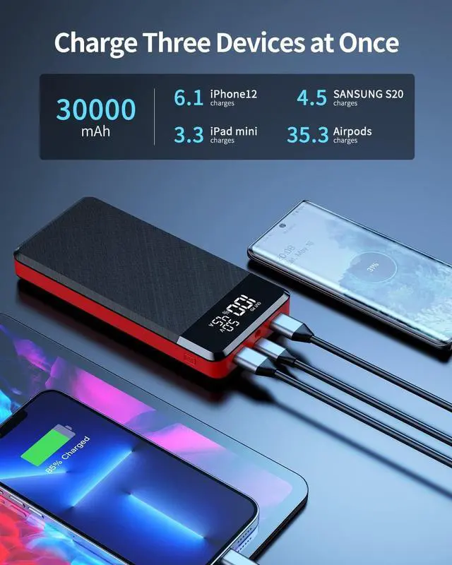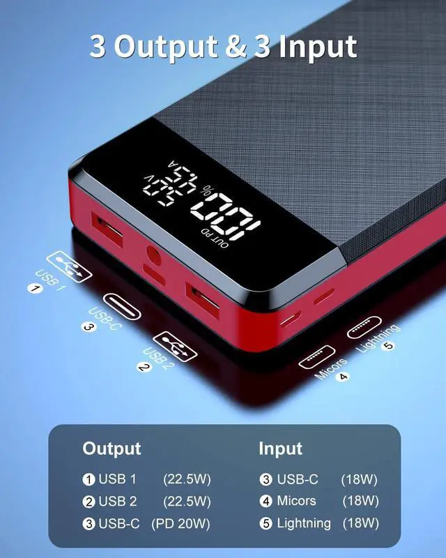 3 Inputs & 3 OutputsFriendly 3-Inputs design allow you to recharge this powerbank with your cord USB C, lightning, or micro USB. Tri-output ports deliver simultaneous, 22.5W high-speed charging to 3 devices, assuring the devices around you not running low.