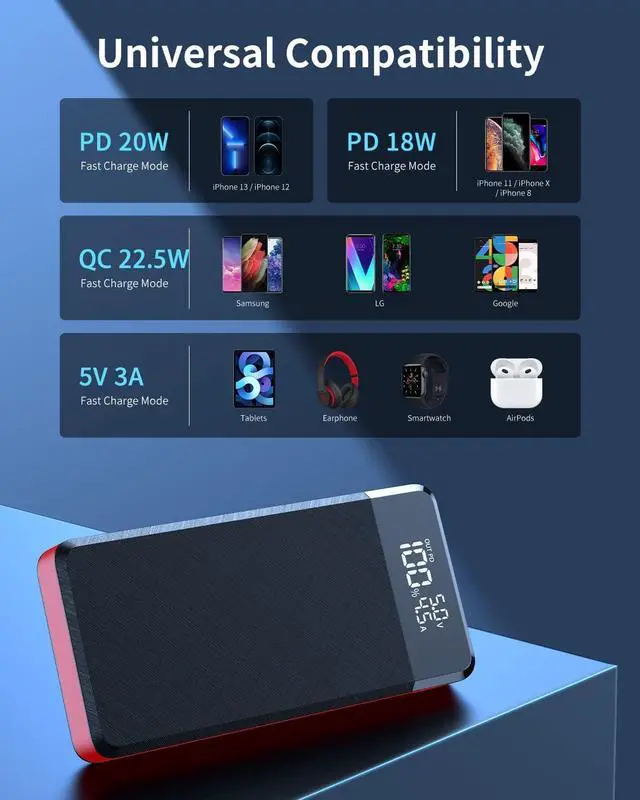 Universal CompatibilityPortable charger is universally compatible with all products via the USB charging cable, work with not only all phones, tablets but your smaller devices like Wireless earbuds, Bluetooth headphones, fitness trackers, smartwatches, etc.