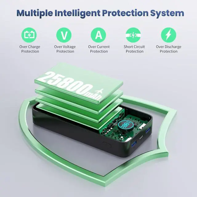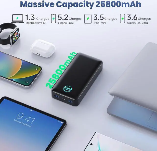 [Huge Power, Longer Trips] with 25800mAh capacity, can power an iPhone 14 up to 5 times and laptop about 1 time. This ultra-high capacity battery pack is talior for travel, road trip or other outdoor activities, and don't worry about sudden power off anymore. (Compliant for Air Travel)