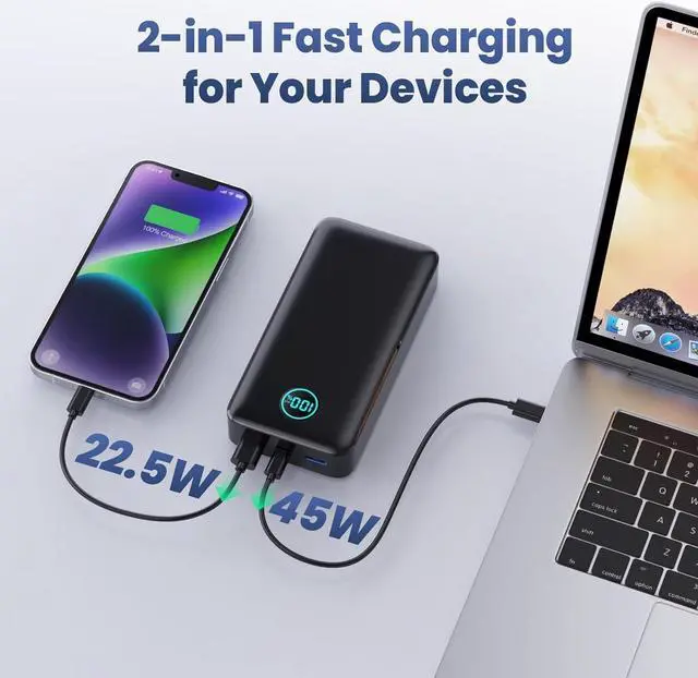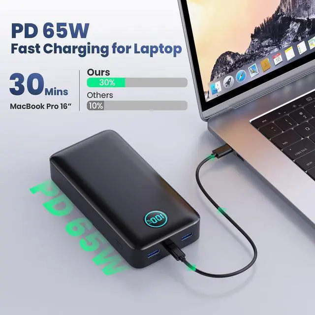 [65W Fast Charging Laptop Power Bank] the Feob latest fast charge protocol 65W support charges your MacBook Pro from 0% to 50% in just 1 hour. Meet your phones, tablets, laptops and steam deck's latest charging needs, perfect for a business trip or outside.