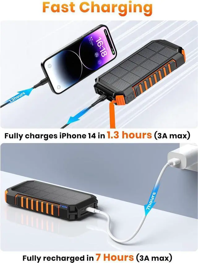 Advanced Wireless Portable Charger: Truly cable-free solar power bank with wireless output supports all QI-enabled phones for inductive charging. Such as for iPhone 11 Pro Max / XS Max / 8 plus, Samsung Galaxy S20 / S10 / Note 10 Plus etc.
