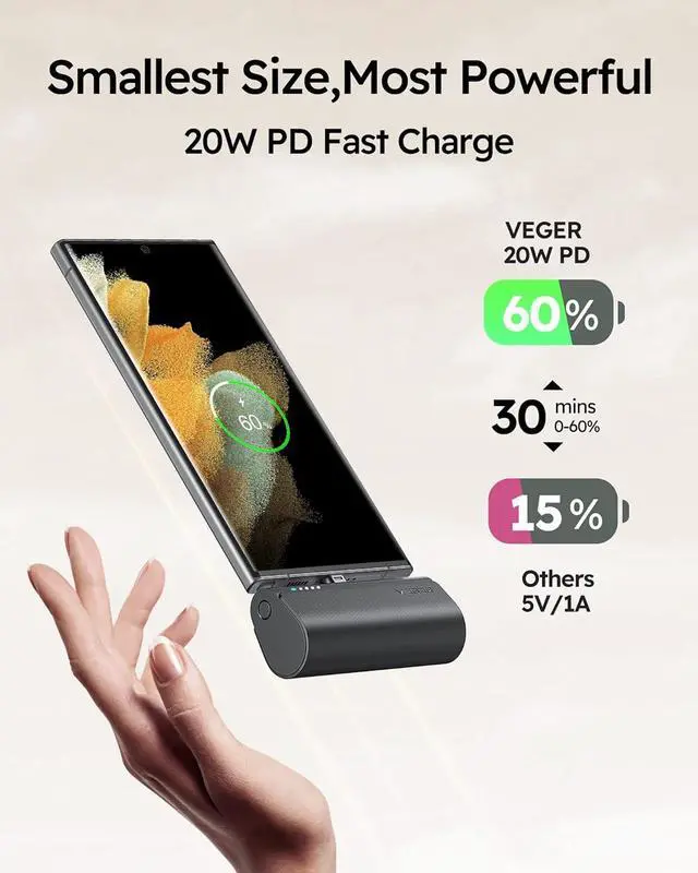 Quick Recharging And Quick Charging: Power bank usb c input or usb c connector input supports QC or PD fast charging protocol. Fully recharged only need 1.5 hours by 9V-2A. Small battery pack usb c output supports PD, QC 3.0, FCP, MTK PE 1.1 / 2.0, AFC... etc fast charge protocol. Thus VEGER mini power bank can quick charge most of your android (type c output) cell phones perfectly.