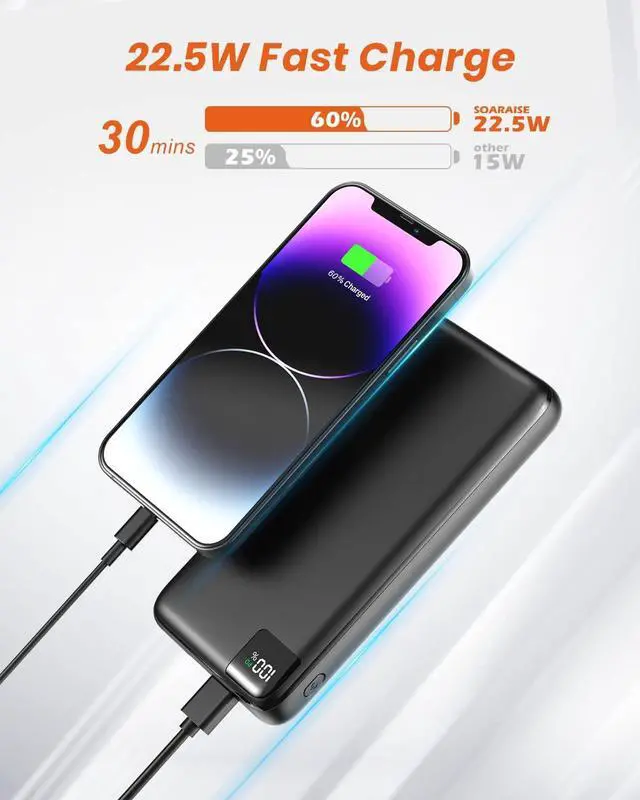 Super-fast Charging: Combined with the latest power delivery 22.5W and QC 3.0 technology, the battery pack delivers an amazing rapid charge to your phone, charging up to 60% in 30 minutes.