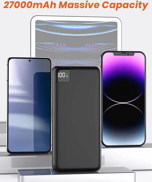 27000mAh Power Bank: The powerful portable charger packs a large cell capacity of 27000mAh to keep your phone, tablet and earbuds fully charged all day long, providing 8 charges for an iPhone 13, 5 charges for a Samsung S20 and 3 charges for a tablet.