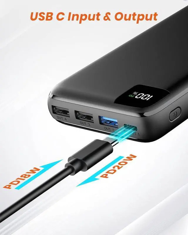 USB C Battery Pack: The USB C input/output port is rated at 18W, which fully recharges the power charger in just 6 hours. Along with the other three USB A outputs, four devices can be charged simultaneously.