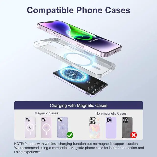 Magnetic Connection: The magnetic wireless portable charger establishes a stable link during charging, guaranteeing a secure and reliable connection. With magnetic attraction capability, it is not easy to move, ensuring your devices stay firmly in place for uninterrupted charging.