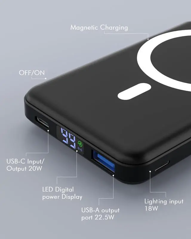 Fast Wireless & Wired ChargingThe mag-safe charger supports 5W, 7.5W, 10W and 15W Max wireless charging, 22.5W max USB-A PD output and max 20W USB-C output; supports max 18W Lighting input and max 18w USB-C input; The mag-safe battery pack can charge 3 devices simultaneously, shared charging with no wait.