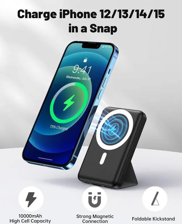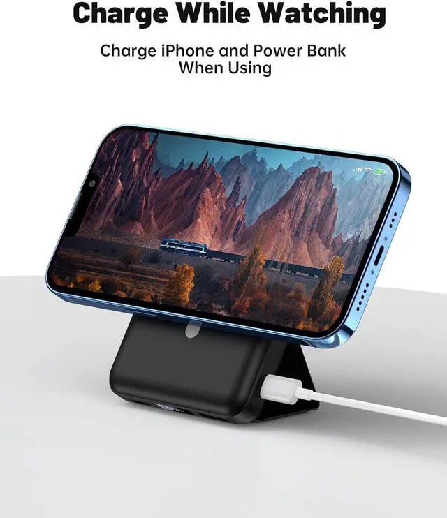 Foldable Stand & Compact Design: Features a versatile built-in foldable kickstand that holds your iPhone 15/14/13/12 upright or horizontal for a comfortable viewing angle. Mag-Safe portable charger is only 0.41 lb in weight and 0.85 in thick. You can easily put it in your pocket or backpack, take it with you everywhere.