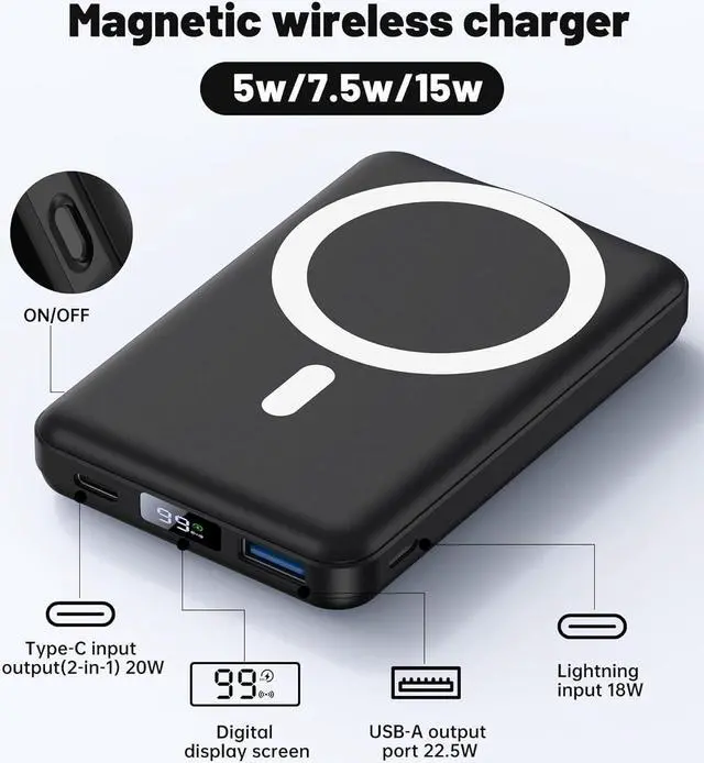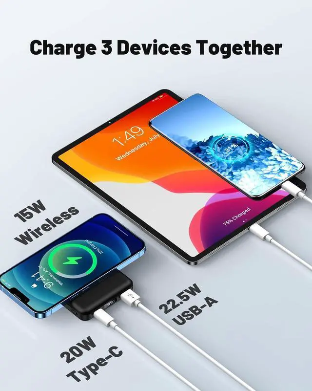 Fast Wireless and Wired Charging: Supports 5W, 7.5W, 10W and 15W max wireless charging, 22.5W USB PD max and 20W USB-C input and output; The magnetic power bank can charge 3 devices at the same time