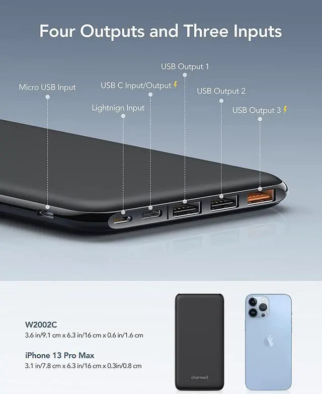 3A High-speed Charging USB C Portable Charger: 25% charging speed faster compared to similar versions on the market. 4 smart USB outputs get the fastest charging by intelligently detecting and regulating the charging current. Provides a total 5.4A output to charge up to 4 devices simultaneously with Charmast battery pack. The versatile USB-C port supports fast input and output. Long-lasting portable charger for iPhone, iPad, Samsung Pixel More