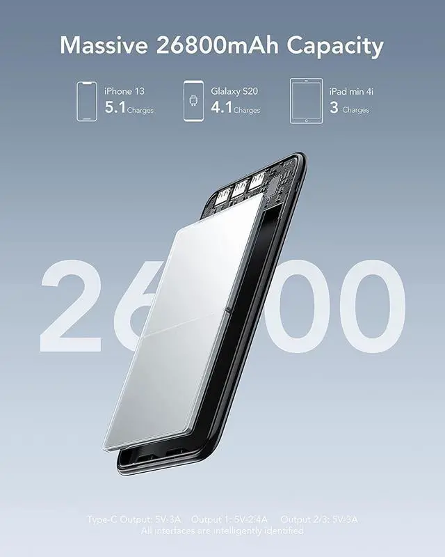 Slim and Compact Battery Pack: The weight of this power bank is around 14.1 ounces, which is just a bit heavy, but the weight matches the actual capacity of 26, 800mAh. Thanks to an advanced slim profile that is only 0.55 inches thick, which makes for a comfortable grip, the fully rubberized cover lets you enjoy a nice touch and protects your device from scratches or drops. A must-have battery pack for cell phones.