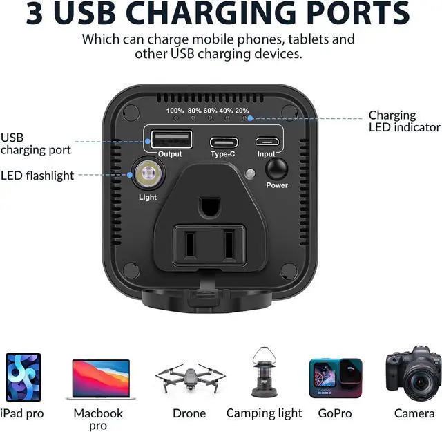 Upgrade 3 IN 1 Portable Charger: As an Ordinary Power Bank When You Do not Use the AC Outlet, It Has a USB Output Port and Type-C Output Port to Power for Your One or Two Devices Freely. 1 USB Input and Type-C Input Ports can be Charged Itself at the