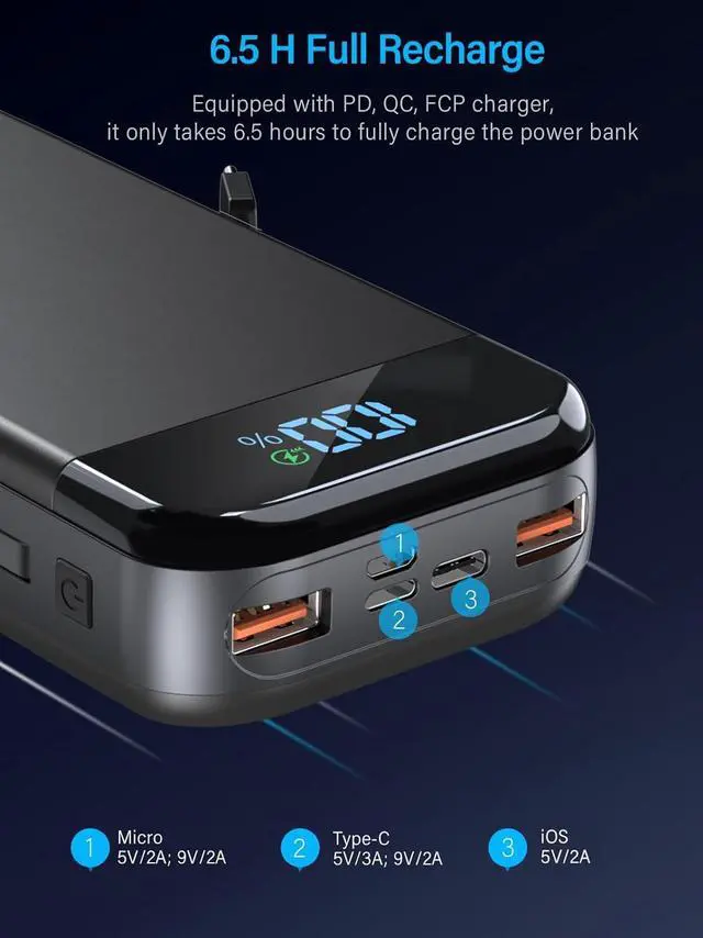 PD 20W Quick Recharging: Micro input, iOS input, Type-C (PD 20W) input & output support bidirectional quick speed charge for most mainstream devices including earphones, mobile phones, smartwatches. Fully recharge this portable charger power bank only need 6.5 hours with a PD 20W charger, which will help you save more time.