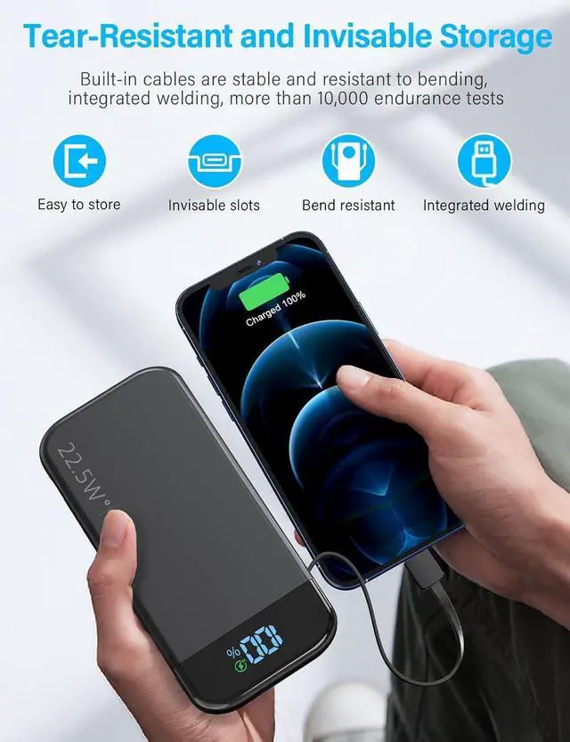 Portable Charger with Built in Cables: The integrated cables with grooves are convenient for storage, more than 10, 000 bending tests prove its durability, tear-resistant, bend-resistant; suitable for most smartphones, or other devices, no worry about the cables when going out.