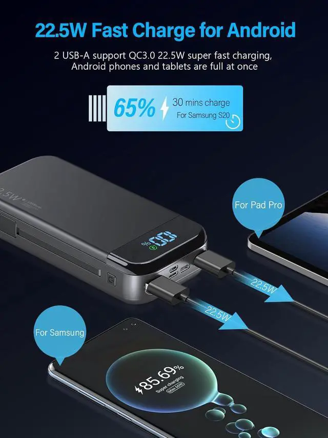 Power Bank Fast Charging: 2 USB-A QC 22.5W output and 1 Type-C PD 20W output, which only takes 30 mins to charge for iPhone 12 up to 50% and 40 mins to charge for Samsung S20 up to 65% by the original mobile phone charging cable, it greatly shortens your charging time; And you can charge 5 devices simultaneously, perfect for sharing them with your family and friends. (Note: If not charged with the original cable, the charging speed will be twice as slow )