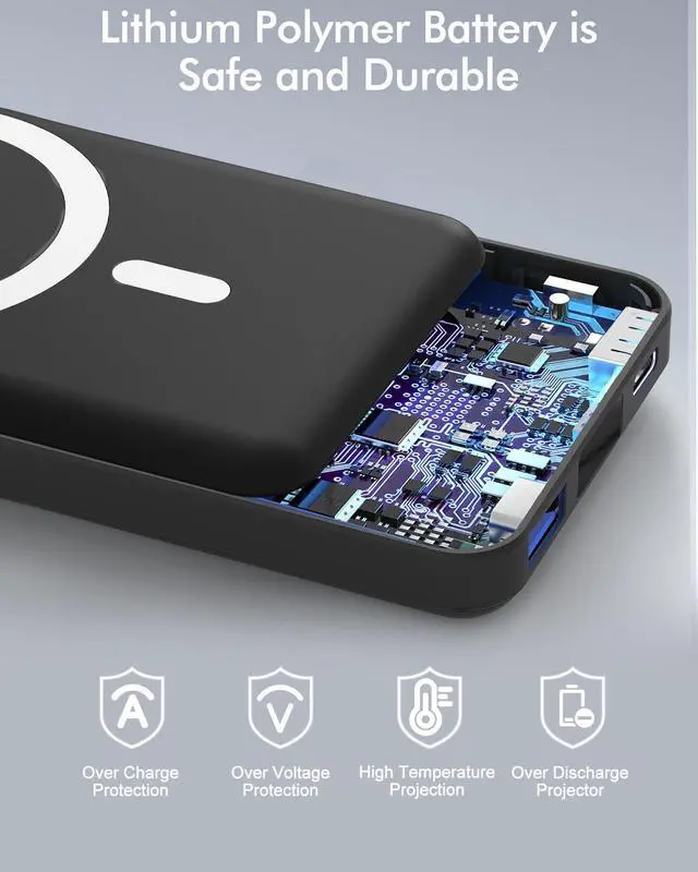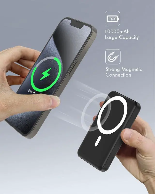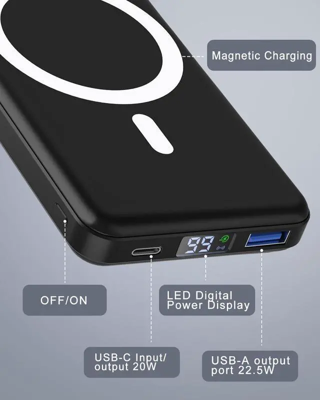10000mAh Large Capacity & Smart LED Display10000mAh large capacity and high density battery design can provide all-day power; The magnetic power bank can charge 2 times for iPhone 15/14/13/12 Pro, about 1.5 times for iPhone 15/14/13/12 Pro Max & iPhone 15/14 Plus; You can know how much the mag-safe power bank is left with the clear digital on smart led display.