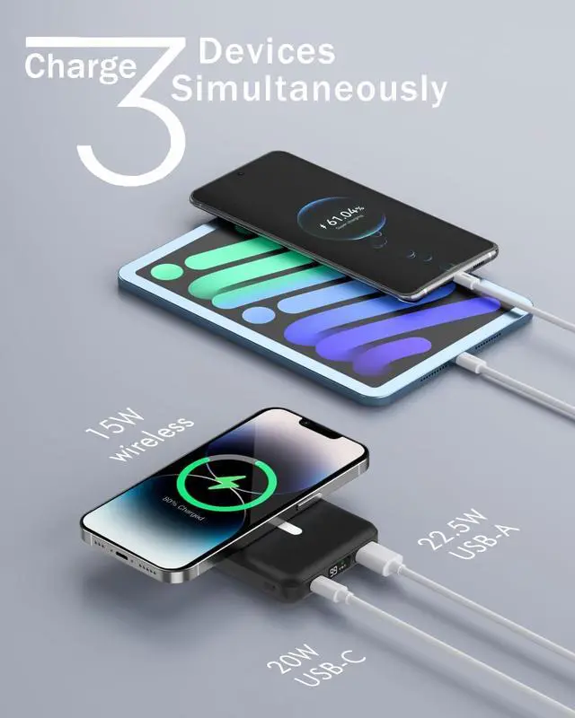 3 Devices Fast Wireless & Wired ChargingThe mag-safe charger supports 5W, 7.5W, 10W and 15W Max wireless charging, 22.5W max USB-A PD output and max 20W USB-C output; supports max 18W Lighting input and max 18w USB-C input; The mag-safe battery pack can charge 3 devices simultaneously, shared charging with no wait. (NOTE: 15W/20W mentioned on the cover of the manual and the 22.5W mentioned on the detail page are both correct as they represent different wattage for different output modes. )
