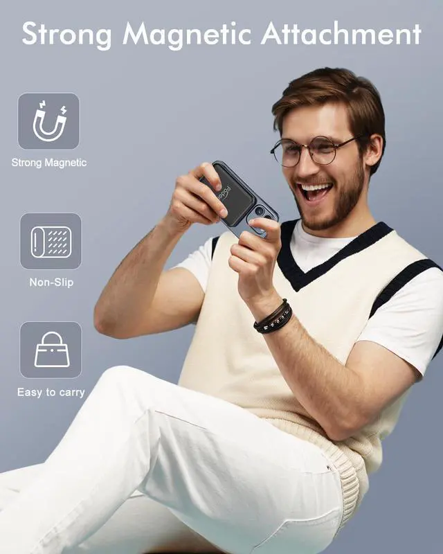 Mini DesignThe wireless charger weighs 0.4 lb, the mini design ensures that you can easily carry around the magnetic power bank outside and single-handedly take calls, selfies, and more. The material is baby-like silicone, which is to better protect your phone from scratches during wireless charging.