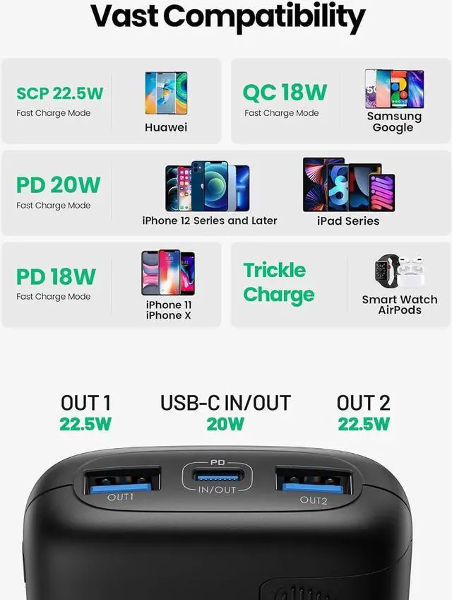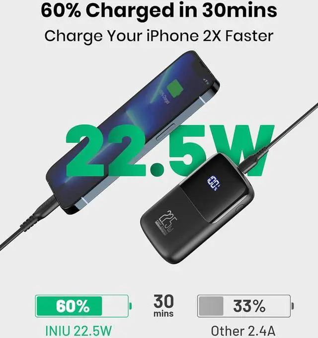 . INIU 22.5W power bank combines the most advanced PD 3.0 and QC 4+ fast charging technologiesit incredibly fast charges your new iPhone from 0 to 60% in 30 minutes, nearly 2X faster than original 2.4A chargers.