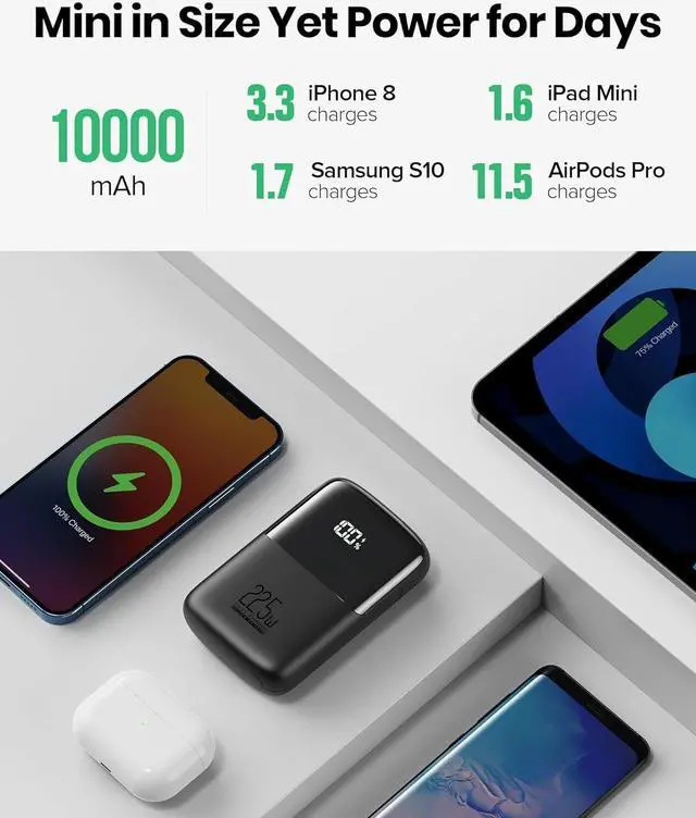 The capacity of 10000mAh is stored in the mini body, providing juice to charge iPhone 8 3.6 times, Samsung S10 2.1 times, iPad Mini 1.5 times, and AirPods pro 12.5 times, etc.