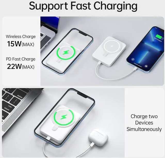 [2-in-1 Fast Charging Charger] Support 22W PD Fast Charging with USB-C output charge. Wireless portable charger support 5W, 7.5W, 10W, 15W Max wireless fast charging. Wireless charging and wired charging simultaneously, charge your two different devices.