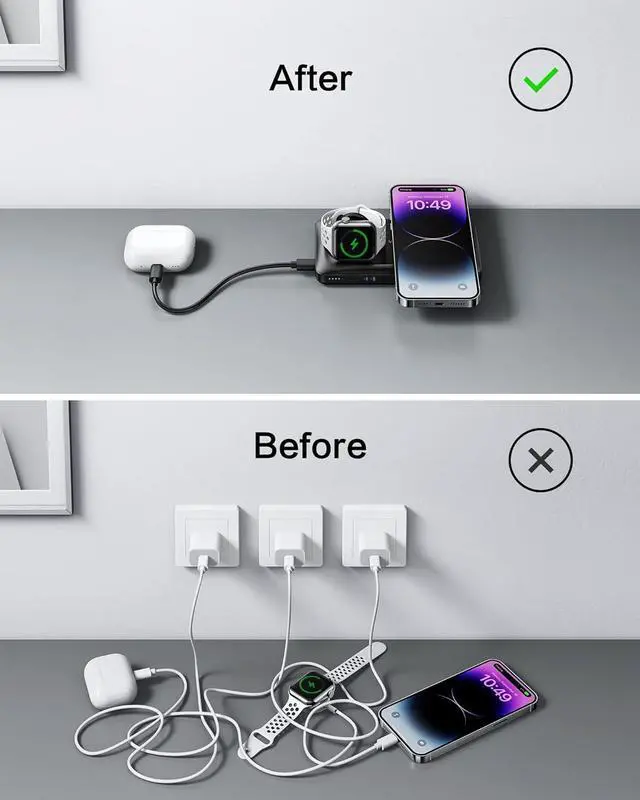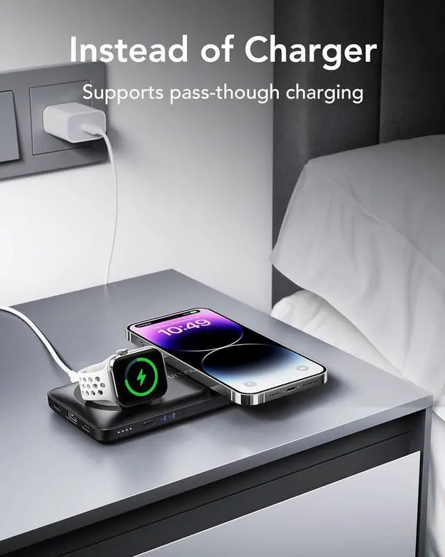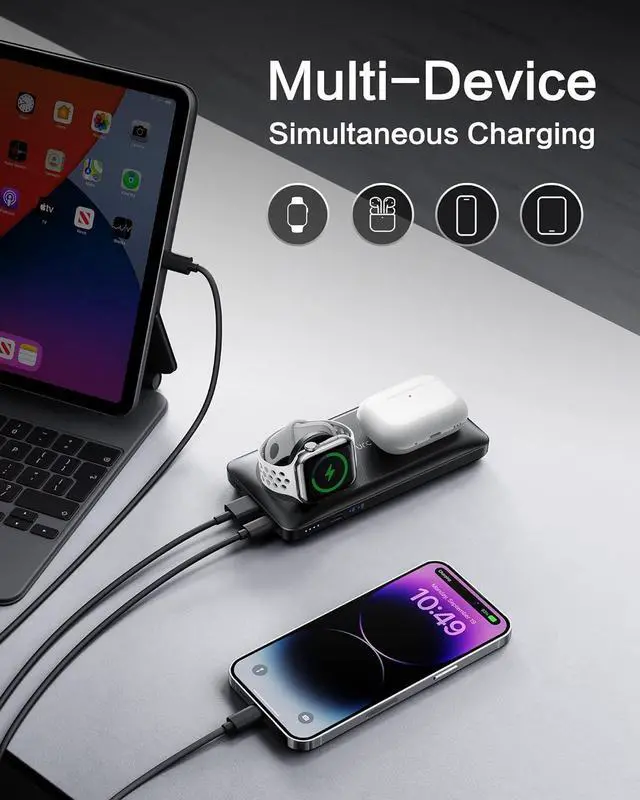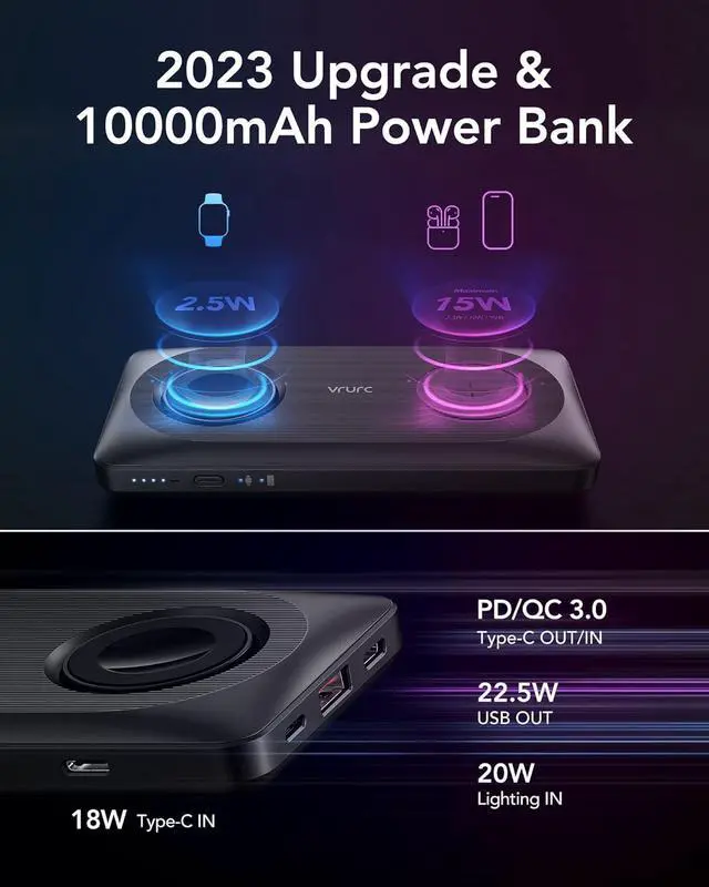 3 in 1 Wireless Charging VRURC magnetic power bank supports wireless charging of iphone, Apple Watch and Airpods, and supports wireless charging of multiple Apple devices at the same time (iPhone + iwatch & Airpods + iwatch). Portable charger compatible with iPhone 14/13/12/11 pro, plus, pro Max, SE/XR/XS/X/8 or Samsung/Android etc. Apple Watch 8/7/6/5/4/3/2/SE, Airpods 3/2/1/pro/pro 2