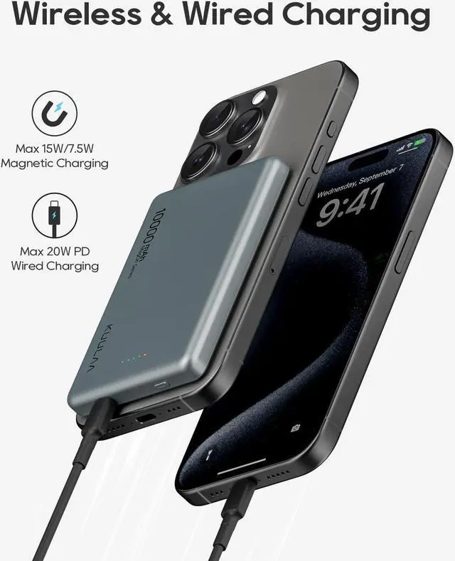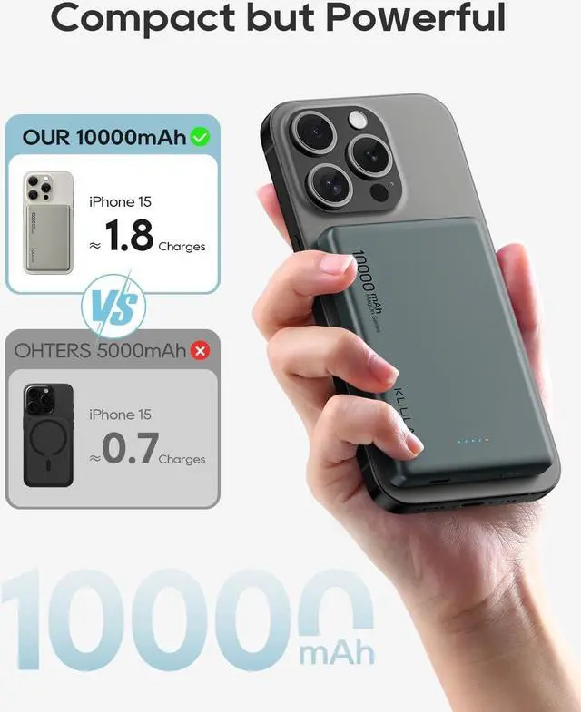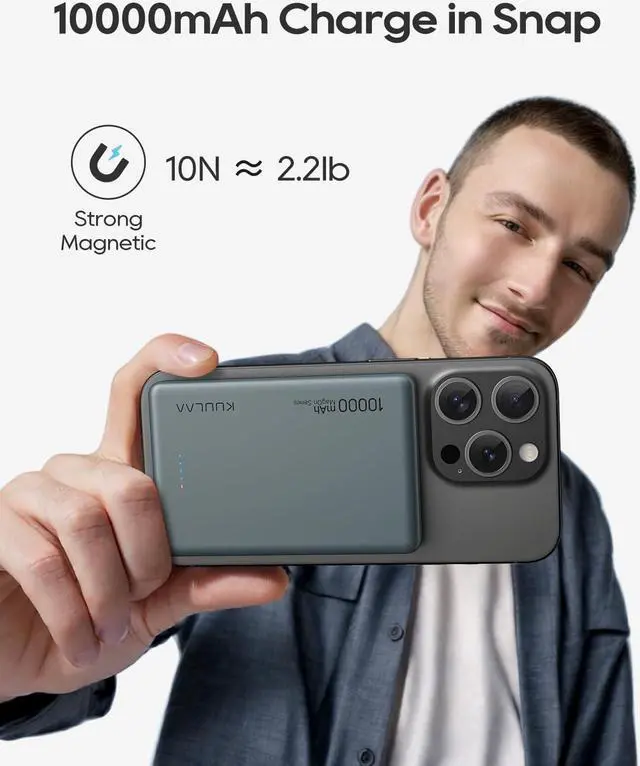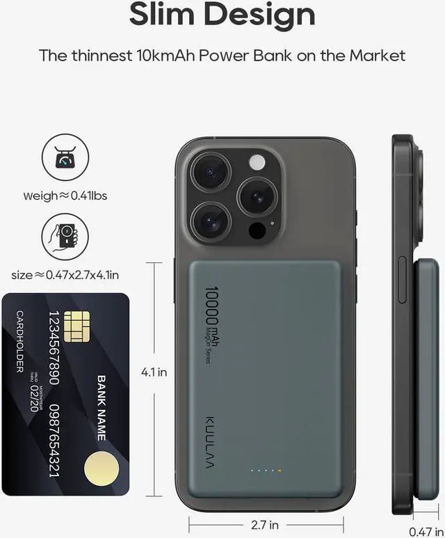 Strong magnet & ultra-thinKuulaa Mag-Safe power bank for iPhone is almost the size of a credit card and fits easily in your jacket pocket. is currently the thinnest Magsafe power bank on the market. The soft silicone surface protects your phone from scratches. Its unique compact aluminum alloy body design gives it an elegant look.