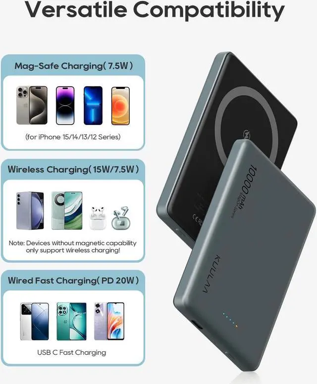 Mag-Safe Power Bank for iPhone 14/13/12 Mag-Safe wireless power bank works with iPhone 12/13/14/15 series. ONLY compatible with MagSafe certified phone cases or without cases. 10000mAh Ultra Capacity Wireless Power Bank. The magnetic power bank uses the latest magnetic technology to ensure stronger magnetic holding force and ensure that it does not slip or fall off easily.