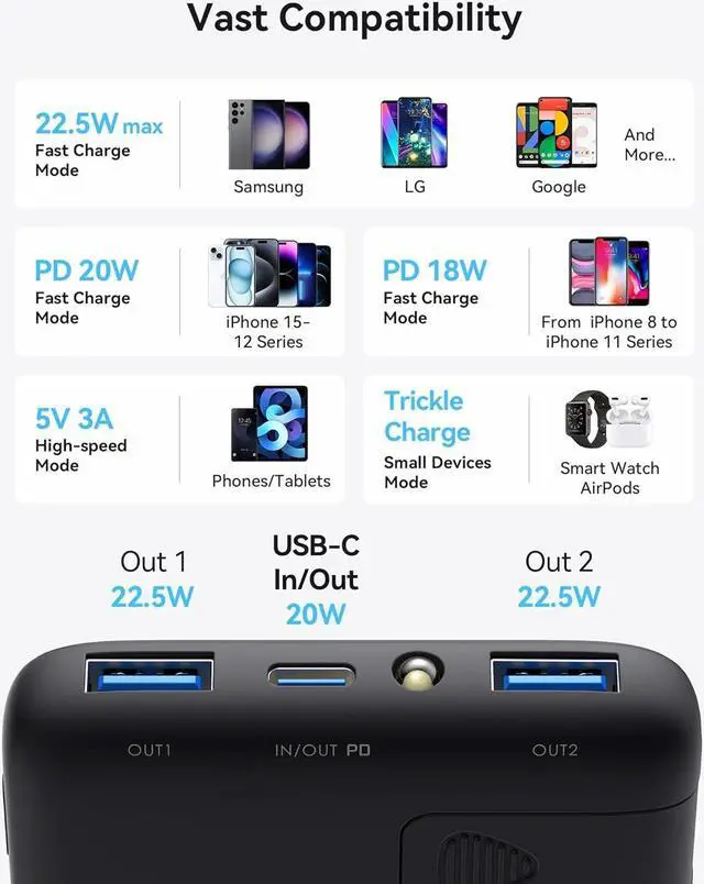 INIU iphone portable charger fast charging fits every device from big as iPads to small as AirPods. Plus an automatically-adapted trickle-charging mode, small devices can also get optimized power without affecting battery health.