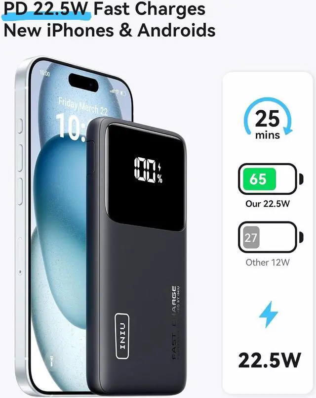 . Combined with the most advanced PD 3.0 & QC4+ fast charging technologies, INIU 22.5W portable charger power bank can incredibly fast fuel your new iPhone from 0 to 65% in 30mins, 2X faster than traditional 2.4A chargers.