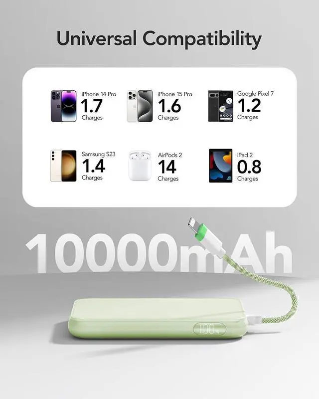 [Universal Compatibility] Equipped with multiple charging ports and built-in cables, it's designed to be compatible with a wide range of devices, including smartphones, tablets, smartwatches, Bluetooth headphones, and more. Whether you have the USB-C devices or Apple devices, this power bank has got you covered.