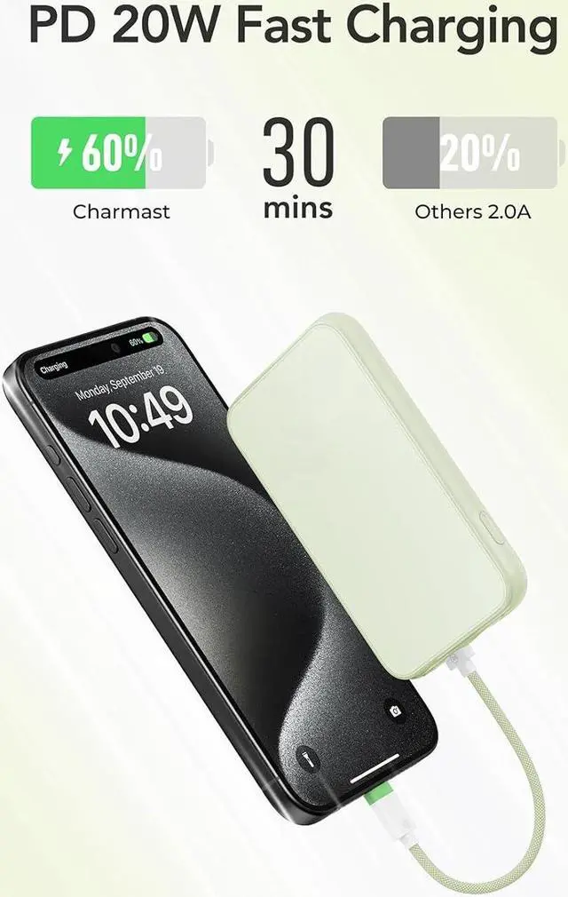 [20W PD Ultra-Fast Charging] Have you grown tired of slow charging and the constant worry of running out of battery? With the Charmast 20W fast charging power bank, you'll see your device's power increase every minute. The Type Port, Type-C cable, and iPhone cable all support PD/QC 3.0 fast charging, giving you more options to charge your devices quickly and efficiently.