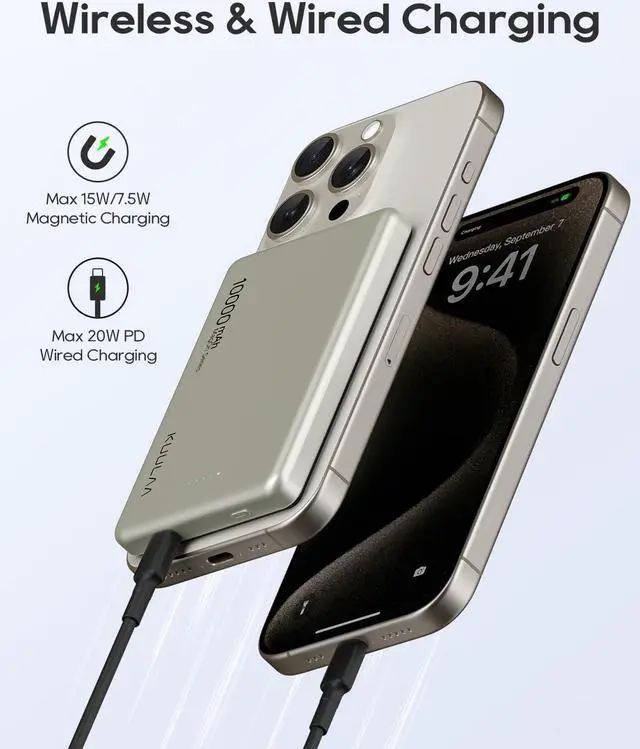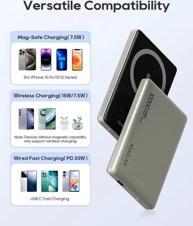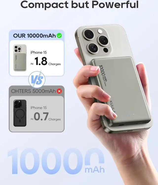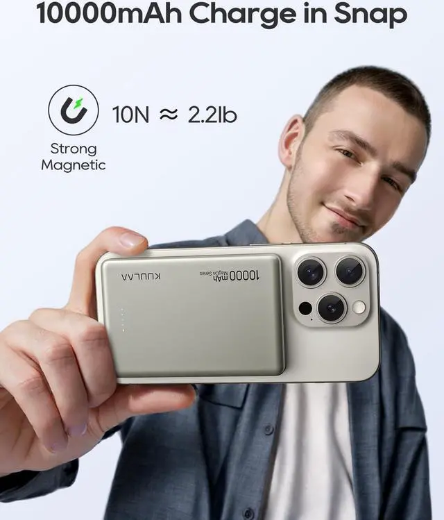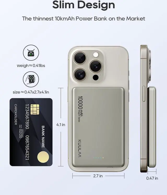 Strong magnet & ultra-thinKuulaa Mag-Safe power bank for iPhone is almost the size of a credit card and fits easily in your jacket pocket. is currently the thinnest Magsafe power bank on the market. The soft silicone surface protects your phone from scratches. Its unique compact aluminum alloy body design gives it an elegant look.