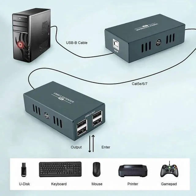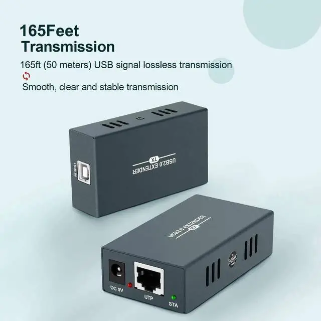 USB 2.0 Extender 165ftUSB Extender over single Cat5e/Cat6/Cat7 cable max up 50 meters. Support 4 USB 2.0 ports. USB 2.0 high-speed transmission (up to 480Mbps). Only one power adapter is needed.
