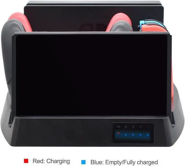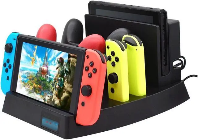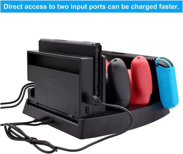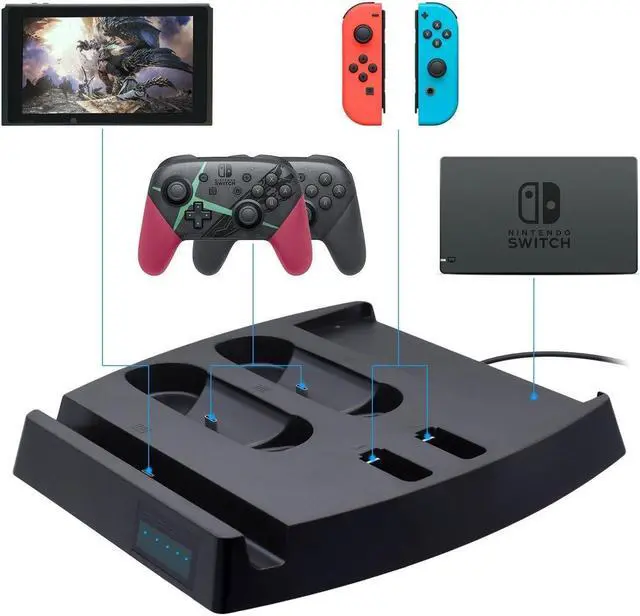 Features: *Great material built and premium look *It holds the Nintendo Switch console mount and secures it well *It allows you to plug Nintendo Switch console, 2 Nintendo Switch Pro controllers and 4 Nintendo Switch Joy-Cons at the same time *Specially designed for Switch console *Charge the console at high Speed *Charge the left & right Joy-con *Charge 2pcs Switch Pro controllers *Charging indicators to show the charging status for controllers and consoles