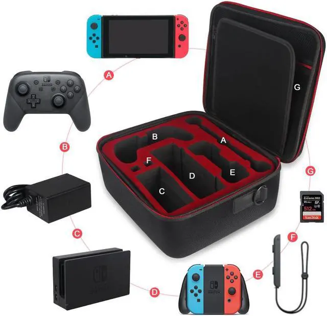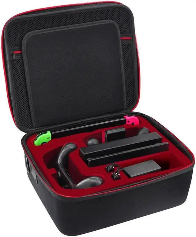 Features: *Deluxe travel carrying case. Specially designed to make your whole Nintendo Switch system even more portable & travel friendly. Comfortable handle strap is ideal for carrying. Large storage is suitable to take all the Nintendo Switch accessories when go on a trip. *Interior grooves securely hold the Nintendo Switch console, 2 Joy-Cons, Switch dock, Joy-Con charging grip, AC adapter. *Interior mesh pocket for other smaller Nintendo Switch accessories like extra Joy-Cons, HDMI cable, Joy-Con straps. *Make going on vacation very easy, perfect fit for outdoor activities and enjoy your Nintendo Switch. *Durable hard protective case. Hard EVA shell case protects Nintendo Switch from drops, scratches, bumps, splash and dust. Soft liner protects your Nintendo Switch console from getting scratches. The design of groove makes accessories separate so that avoid to scratch each other. *Easy to carry with the comfortable handle strap. All-around zipper is easy Opening and Closing. Everything is easy to put in and take out and fits securely.