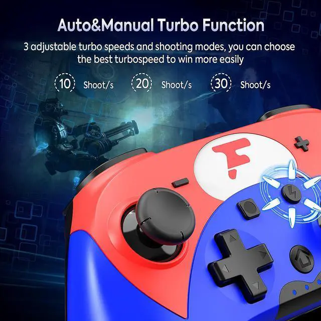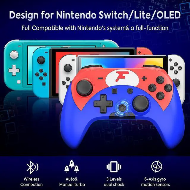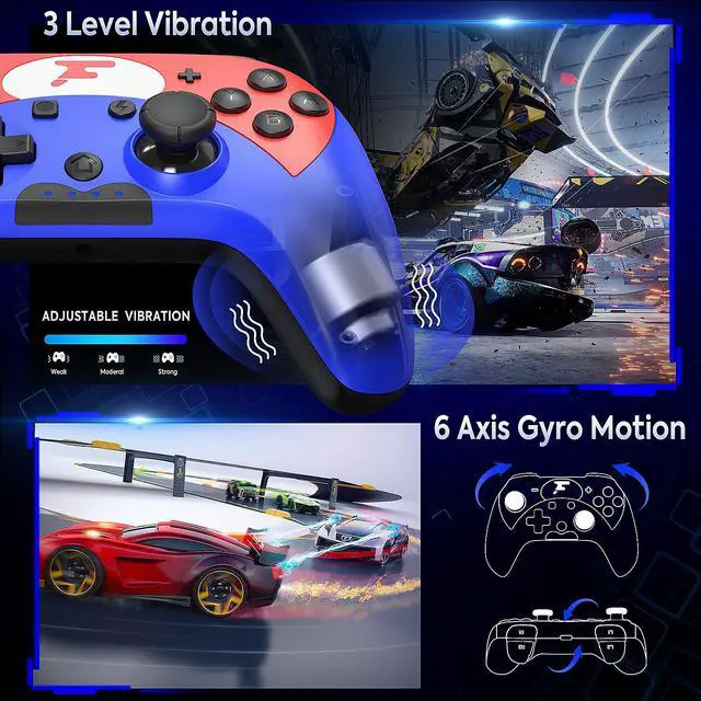 CLASSIC MARIO STYLE WITH 3 SPEED TURBO FUNCTION The wireless switch controller is designed with stylish and classic Mario element, also the switch remote compatible with the nintendo switch/Lite/OLED console and comes with most functions as the wireless nintendo switch pro controller, the switch controller wireless built-in sensitive sensors and 10 shoots /s, 20 shoots /s, 30 shoots /s turbo speed, provide a better game playing with Super Smash Bros and other shooting games; DUAL VIBRATE FUNCTION & 6-AXIS GYRO SENSORThe switch pro controller provides 4-level adjust vibration on switch games. The wireless controller for the Nintendo switch provides you with excellent vibration feedback.