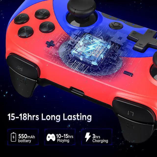 12-15Hrs LONG-TIME Playing and Low Battery reminderThe switch pro controller is the best choice for switch gamers, the switch remote for nintendo built-in 550 mAh battery, provide 12-15 Hrs runtime after 2-3hrs charging. Let you have uninterrupted game time. And the switch controller pro has a low battery reminder function to escort you. The best replacement for Nintendo switch controllers.