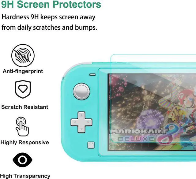 [Screen Protector] Come with 2 * tempered glass screen protectors for Switch Lite. Only 0.33 mm thickness screen protector maintains response sensitivity. Hardness 9H keeps screen away from daily scratches and bumps.