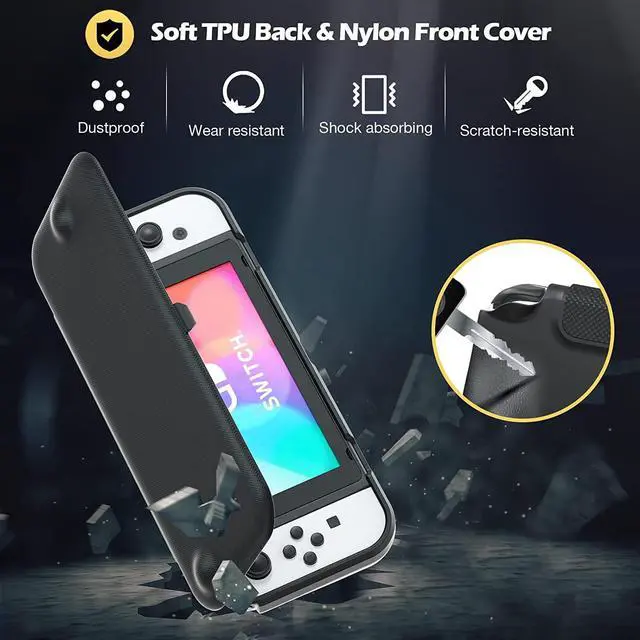 Made from soft TPU back cover and high quality nylon material front cover, easy to put on and take off, also protects your device from dust, bumps and drops; The microfiber interior keeps your Switch screen free of scratches
