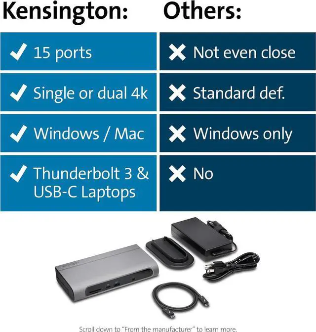 Our SD5600T Thunderbolt 3 and USB-C Dual 4K Hybrid Docking Station - 100W PD Win/Mac is the ultimate docking station for maximum productivity and compatibility. Features include universal compatibility, the flexibility to select between HDMI 2.0 and DP 1.2, horizontal or vertical placement options, built-in SD and Micro SD card readers, seven USB ports (two with charging), one Gigabit Ethernet port, and one audio combo jack. Three-year warranty.